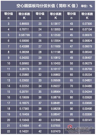 下面“圓均分弦長(zhǎng)系數(shù)”K值表或許能夠給你帶來(lái)方便(如下圖):