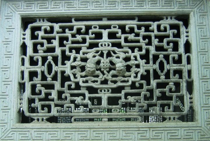 石窗以長方形為最多,還有方形、圓形、拱形等。長方形的石窗一般以直式為多,橫式次之。石窗窗心的形態(tài)更是多樣,窗心有不分層的,也有分層的,分層的多分為二層或三層。分為二層的,多有主次之分,或上大下小,或上小下大,大的部分作主題紋飾,小的部分作輔助紋飾。分為三層的多以中心一層最大,上下兩層大小對(duì)稱。不分層的或作一整體雕刻,或在中心作一主題雕刻,四周圍繞各種裝飾。中心雕刻的形狀有非常多的變化,或方或圓,或扇形,或瓶形,或多角形,不一而足。中心雕刻使石窗主題更加突出,在裝飾上又增添了變化,在視覺上更加豐富。