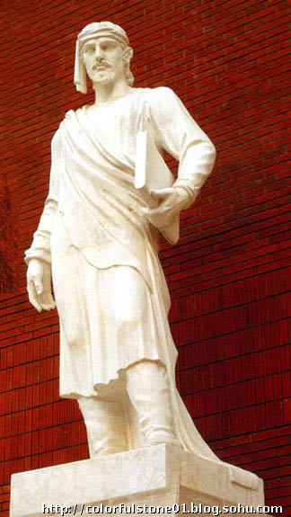 聳立的紅磚墻建筑與馬可波羅漢白玉像交相輝映,雕塑的設(shè)計(jì)與制作充分考慮了環(huán)境需求,是一件成功的藝術(shù)作品。
