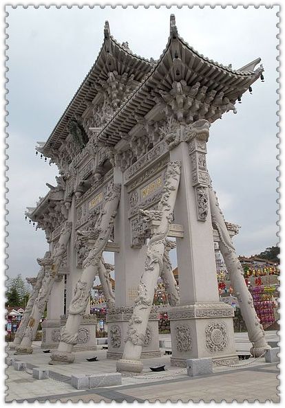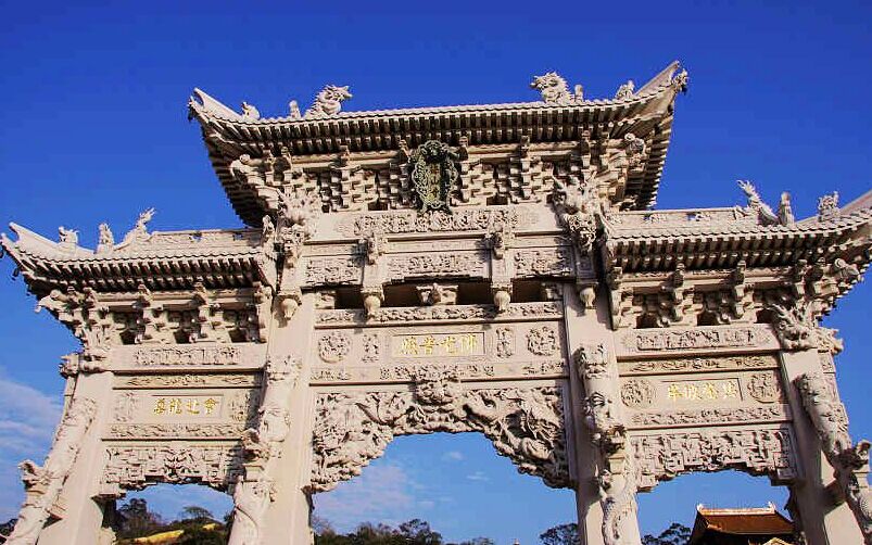 整座山門造型獨特,兩側(cè)護(hù)衛(wèi)山門的八根特殊龍柱,又稱“福賜八大龍金剛”,與山門形成穩(wěn)固的三角形,這在全國的石質(zhì)山門中絕無僅有。支撐山門的其他柱子則采用了多重疊加方式,先垂直后倒掛,遍布整座山門有100多條龍,象征著富貴和吉祥。據(jù)報載山門的修建請來了近60名一流的福建惠安石雕師傅,前后耗時3年,耗資1000萬元左右。