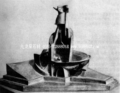波菊尼在《未來主義雕塑技巧的宣言》中主張“絕對和完全廢除確定的線條和不要精密刻劃的雕塑。我們要把人物打開, 把它納入境之中……透明的玻璃、鐵塊、金屬絲、室內(nèi)和室外的燈光能夠表示平面、方向以及一種新的現(xiàn)實的調(diào)子和中間調(diào)子”。(6)未來主義者就是希望達(dá)到讓作品與環(huán)境、形體與空間互相貫穿。波菊尼在他的《空間中一個瓶子的發(fā)展》這件靜物雕塑上, 傳統(tǒng)的雕塑空間被擴大。瓶子被解體后又重新構(gòu)成, 但作品此時已經(jīng)和介于它與環(huán)境之間的基座融為一體, 呈現(xiàn)一種向空間極度擴張的態(tài)勢。這件僅有15英寸高的青銅作品卻能盤居著一個巨大的空間量。他還通過其它作品的實驗,驗證了他在雕塑中所追求的永久價值——“運動的風(fēng)格”和“雕塑即環(huán)境”, 而這反倒是另一種對“未來”的預(yù)言:其“運動”真的波及到達(dá)達(dá)主義、超現(xiàn)實主義雕塑以及波普雕塑家環(huán)境流派的“環(huán)境”觀。