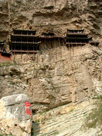 懸空寺,懸掛在北岳恒山金龍峽西側(cè)翠屏峰的半崖峭壁間,始建于北魏太和15年(公元491年),始建初期,最高處的三教殿離地面90米,因歷年河床淤積,現(xiàn)僅剩58米。1957年列為山西省重點(diǎn)文物保護(hù)單位,1982年,列入全國(guó)重點(diǎn)文物保護(hù)單位。整個(gè)寺院,上載危崖,下臨深谷,背巖依龕,寺門(mén)向南,以西為正。全寺為木質(zhì)框架式結(jié)構(gòu),依照力學(xué)原理,半插橫梁為基,巧借巖石暗托,梁柱上下一體,廊欄左右緊聯(lián)。