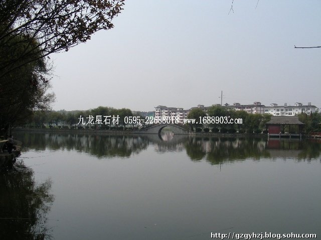 小橋綠樹垂竿倒影水中,景色麗人。