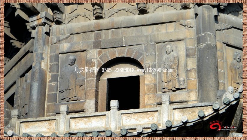 石塔不但堅固無比,而且造型精致。塔頂有八條大鐵鏈,連結(jié)八個翹角與剎頂,顯得氣勢磅礴,紫氣飄搖。每一層塔壁上還刻有十六幅浮雕,共計 80幅栩翎如生的人物雕像。東塔已于 1997年人選全國四大名塔郵票。