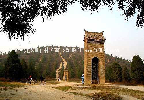 乾陵是唐朝第三代皇帝李治和女皇武則天的合葬陵,位于陜西省乾縣城北6公里的梁山上,距西安80公里。東有豹谷,西有漢谷,依山為闕,氣勢雄偉。這是唐十八陵中最有代表性和迄今保存最好的一座陵墓。陵園內(nèi)城的南北城墻各長1450米,東墻長1582米,西墻長1438米,墻體厚2.4米。乾陵的地面設置,遺留到現(xiàn)在的主要是陵墓石刻。這些石刻十分精美,屹立在梁山之巔,至今已有1200多年的歷史。另還有朱雀門外兩座大碑,即“七節(jié)碑”和著名的“無字碑”,以及石像61尊。圖片: