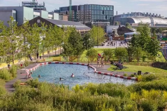 有時,設計意圖比作品顯現(xiàn)出的形式更為重要,這個公園便是如此。該裝置項目意在引導人們思考自然與變化的城市環(huán)境間的關(guān)系。在設計師們看來,當公園被圍繞在相對永久的建筑物中時,這些待開發(fā)的空間卻在持續(xù)的變化中。因此,他們在國王十字街修建了一座泳池,吸引著人們?nèi)秤巍?/p>