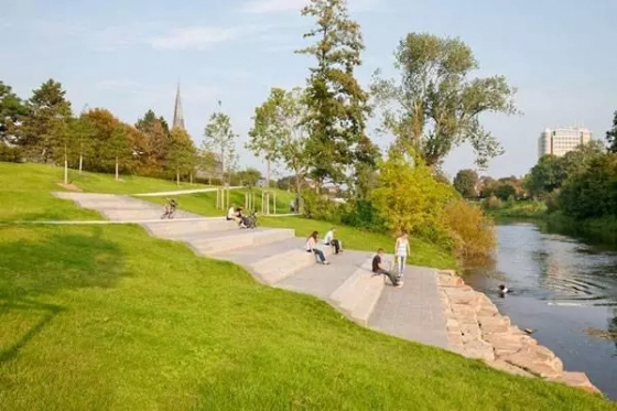 這座公園位于利珀河畔,設計師遇到的主要挑戰(zhàn)便是公園與河道間5米的落差。面對這個問題,設計師修建了一條步道和幾組臺階,讓這里可作為戶外活動的露天劇場。這樣的設計既保留住了原有的景觀,又讓河道依舊是整個景觀的亮點。