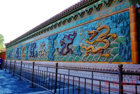 其中最華麗的一座是北京北海的九龍壁,原屬明代離宮的一座影壁。它由彩色琉璃磚砌成,兩面各有蟠龍九條。如果仔細查看,影壁的正脊、垂脊、筒瓦等處還雕有許多小龍,大小龍共計635條,可謂洋洋大觀。