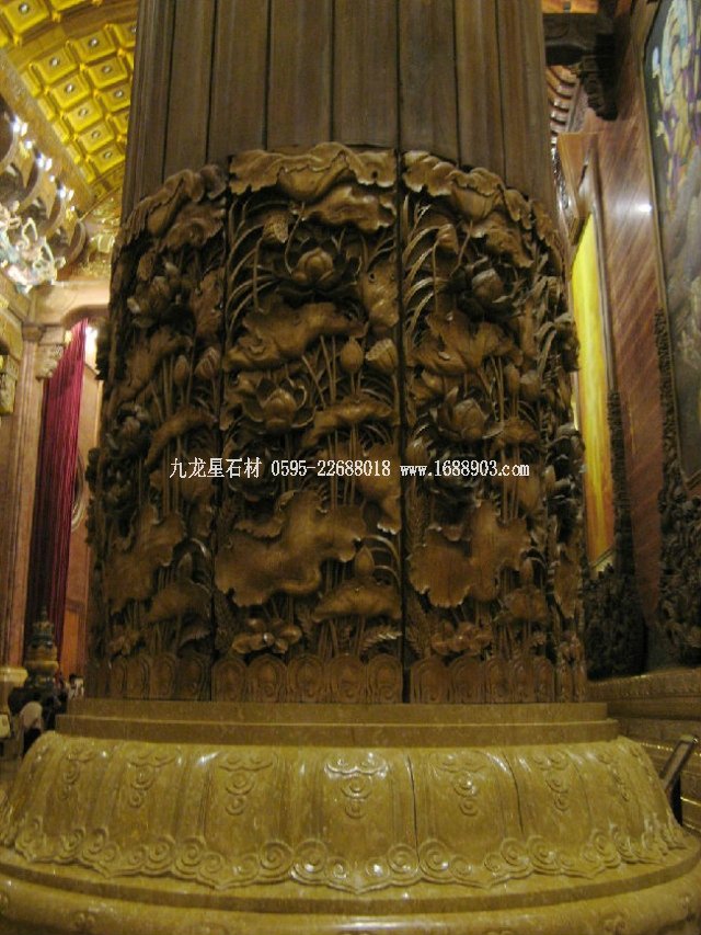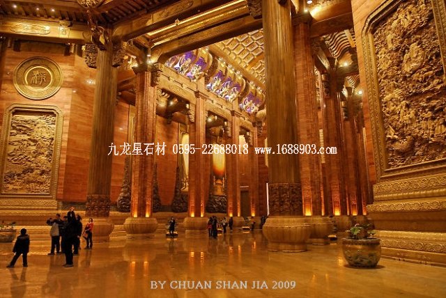 這些木雕均出自浙江東陽一班木雕藝人之手。浙江東陽是中國木雕之鄉(xiāng),北京故宮及蘇、杭、皖等地都有精美的東陽木雕留世。據(jù)統(tǒng)計(jì),整座靈山梵宮的木雕裝飾面積達(dá)1.5萬平方米,用掉2400多立方米的原木。比如一座塔廳高就有65米,跨度為46.6米,面積為2000多平方米,這樣的空間規(guī)模在東陽木雕裝修工程中,從無先例,這比在故宮施工還要難!為此東陽幾乎傾全縣之力,42個廠家,1560多名工匠,從2007年底接手,連續(xù)制作1年零4個月才最終順利完工。
