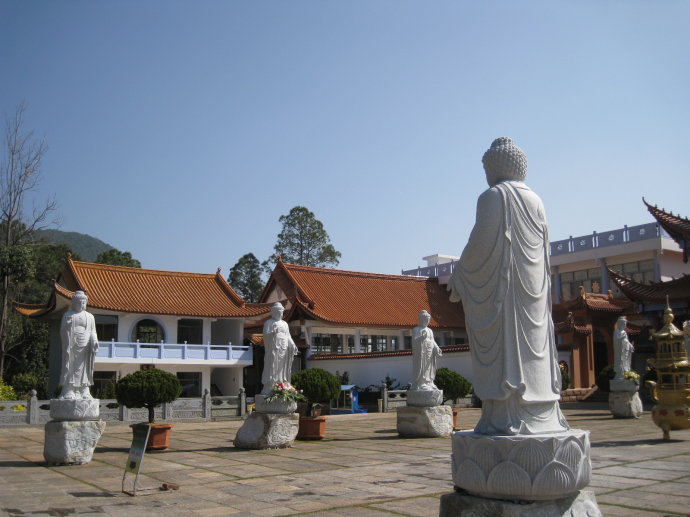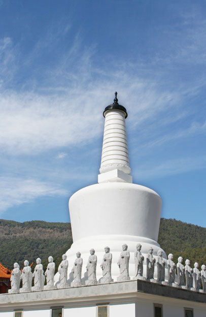 在大雄寶殿和藏經(jīng)樓的設(shè)計(jì)上采用了3層月臺(tái)作為基座,臺(tái)基采用清式的須彌臺(tái)座為基本式樣,在座基的細(xì)部雕刻上簡(jiǎn)化了清式復(fù)雜的雕刻,使得整個(gè)月臺(tái)更加大氣簡(jiǎn)潔,以襯托建筑的巍峨莊嚴(yán)。大雄寶殿和藏經(jīng)樓基座中間沿中軸線設(shè)臺(tái)階(御路),臺(tái)階中間設(shè)置佛教文化題材的石雕。其它建筑的基座采用磚石基座,以示主次之別。屋頂?shù)奶厥廨喞侵袊?guó)建筑最顯著的特征。大雄寶殿及藏經(jīng)樓屋面采用歇山式,歇山是懸山與廡殿合成,垂脊的上半與懸山完全相同,下半與廡殿一樣。觀音殿屋面采用廡殿樣式,4坡5脊。