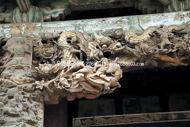 三義殿前廊上排列的四根人物石柱每根柱上都雕有人物故事。從東面往西看起:第一根石柱上雕刻的是人們熟悉的“郭子儀子婿拜壽”的場景片段:柱上“七子八婿,皆顯貴朝廷”。郭子儀端坐堂上,喜形于色,享受著兒女們的孝道之心。在其周圍,還有官員、女眷、士兵、家丁、童子、樂手等人物,姿態(tài)各異,栩栩如生。第二根石柱上人物更加豐富,從下到上處處分布著人物,主要故事為瓦崗寨的故事,立于城墻內(nèi)的人物分別有持月牙板斧的瓦崗寨寨主程咬金,慣用殺手锏的秦瓊,手拿梅花槍的羅成等。第三根柱子上雕刻的是悠然釣魚的姜太公,踏著風火輪的哪吒三太子,凌空展翅的雷震子,游走地下的土行孫。第四根柱上,雕刻著盛唐時期山東壽張縣百歲老人張公藝九世同堂和治家有方的故事。(侯楠山)