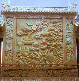 莊園大量的石雕,還是砂石作品。其石材多取于附近山中,質(zhì)地有白、綠、紅、青多種,主要用于橋、廳、臺(tái)、廊的護(hù)欄和柱體,半亭花墻、影壁和牌坊,刀法較青石作品粗獷、雄渾,畫面疏朗典雅、疏密得當(dāng)、虛實(shí)和諧、古樸堅(jiān)實(shí),顯得特別有氣魄。杏壇、街心牌坊、祠堂獻(xiàn)廳圍欄、養(yǎng)和堂階欄、半亭、三星影壁和莊園西門魚躍龍門巨幅石額,就是砂石雕刻的代表作。