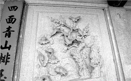 步入正門,只見大門兩旁立有兩個黑色的扁體石鼓、部分石雕等,其工藝相當(dāng)精細(xì)。正面兩邊墻壁上鑲嵌有完整的“麻雀戲梅”通花石雕,供游人觀賞、品味;抬頭望去,屋頂為穿斗式、架梁蓋瓦的硬山頂結(jié)構(gòu)。