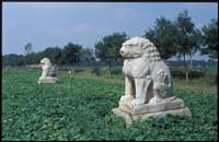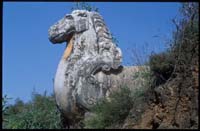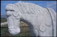 古代陵園石雕遺存實(shí)物最早的是引人注目的西漢霍去病墓石雕,作品原在陜西省興平縣漢武帝茂陵東面霍去病墓上與墓前?,F(xiàn)已發(fā)現(xiàn)的石雕作品有造型各異、天趣宛然的動(dòng)物、人物等共十四件。霍去病為西漢名將,漢武帝為表彰其功、紀(jì)念其人,于茂陵東面選定其墓址并“為冢象祁連山”,據(jù)《史記?衛(wèi)將軍驃騎傳?索隱》記:其墓“冢上有豎石,前有石馬相對,又有石人”。今存作品即記載中的部分原物。它們可以分為兩類,一是通常被稱之為“馬踏匈奴”的立馬,二是其它渚石。立馬的原在位置是墓前不遠(yuǎn),長年來未有大的移動(dòng),從形式上看為靜立姿態(tài),尺度適中,符合一般早期墓前石雕的制作規(guī)律,相信此即記載中相對而立的石馬,只是另一件已無存,“石人”也不見了。唐薛逢《漢武帝祠》詩云:“茂陵煙雨埋弓箭,石馬無聲蔓草寒”。詩中所指茂陵石馬當(dāng)系帝陵制度,但與霍墓立馬的位置及造型表現(xiàn)肯定有直接關(guān)系。西漢時(shí)期陵園墓前設(shè)置石雕已成風(fēng)氣,關(guān)于石人石獸的記載與遺存并不罕見,因此霍去病墓前石馬并非例外,實(shí)屬常規(guī)設(shè)置,它為我們提供了代所完善的石象生設(shè)置與造型形式之源的現(xiàn)知最早實(shí)物證據(jù)。