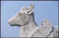 漢代墓葬手段逐漸完善之時(shí),神靈的偶像也大規(guī)模出現(xiàn),它們體現(xiàn)著人們對神的認(rèn)識、崇拜和依賴,它被認(rèn)為會(huì)給陵墓帶來吉祥,給墓主靈魂以庇護(hù)和幫助,會(huì)驅(qū)逐鬼怪邪祟。魏晉南北朝時(shí)期這種偶像化更為明顯,為后代確定了神靈崇拜的偶像模式。陵園神道兩側(cè)列置著石雕天祿辟邪;墓室里陳放著陶塑的鎮(zhèn)墓獸;壁畫描繪著羽人、飛天、神靈;墓門棺槨上也刻劃著方相氏的形象。前代的這種審美表現(xiàn)因素影響著唐陵石雕藝術(shù)表現(xiàn)的一個(gè)重要方面,即歸結(jié)出天馬、天鹿等神靈崇拜的占有一定比例的造型表現(xiàn)部分。末陵石雕的角端、瑞禽明清陵園石雕的麒麟、獬豸等都是這種基礎(chǔ)內(nèi)容模式的演變。先民們試圖通過陵墓這一特殊的環(huán)境達(dá)到人與神的有效溝通,在這個(gè)意義上造型手段起著關(guān)鍵性作用。陵墓被視為人神共處的理想化的虛幻而可信的環(huán)境,在這里天國、人間、地獄融為一體,形成完整的世界。可以說,對神靈的崇拜心理和原始宗教的世界觀是決定墓葬表現(xiàn)形式的重要因素。