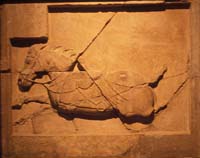 “昭陵六駿”,與其說是表現(xiàn)雕刻的美不如說是表現(xiàn)繪畫的美。據(jù)記載,昭陵是在杰出美術(shù)家閻立德主持下修建的,并由其弟閻立本圖繪十四國君長像為石刻范本?,F(xiàn)存十四國君長像頭部殘塊顯示的確有寫真特征,面部皺紋用線刻形式加以表現(xiàn),甚至眼角的紋路亦不放過,形象追求“寫真性”,突出個(gè)人的容顏特點(diǎn),在某種程度上帶有一定的摹刻繪畫性,不同于一般的石人?!傲E”所表現(xiàn)的是唐太宗征戰(zhàn)慣用的六匹戰(zhàn)功馬,宋游師雄題《六駿碑》中記述了石刻當(dāng)時(shí)安置的次序:颯露紫(西第一)、特勒(勤)驃(東第一)、拳毛馬咼 (西第二)、青騅(東第二)、白蹄烏(西第三)、什伐赤(東第三)?!傲E”表現(xiàn)為類似于漢畫象石刻中浮雕的形式,在方形外框中刻畫馬的側(cè)面形象,韻致非常接近于唐代繪畫中馬的表現(xiàn)?!傲E”是具體指象,即“刻石為常所乘破敵馬六匹”(《唐會(huì)要?卷二十》),有形象的特定要求,而且選擇了戰(zhàn)馬中箭、奔馳、療傷的情節(jié)并刻畫出了馬頸部的“三花紋”這類細(xì)節(jié)。這都宜于繪畫表現(xiàn)而不宜于圓雕表現(xiàn)。既然人像石雕可以繪畫為范本,馬的石雕當(dāng)然也完全可能以繪畫為范本。昭陵沒有效法圓雕形式表現(xiàn)鞍馬,原因之一就在于類似畫象石的浮雕形式更便于傳達(dá)繪畫性表現(xiàn)內(nèi)容,避免圓雕所受的材料限制,從而傳達(dá)“六駿”特有的紀(jì)實(shí)性審美意味。