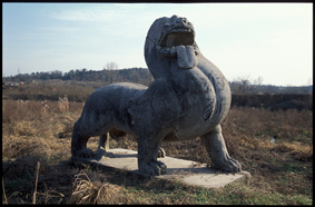 中原地區(qū)從戰(zhàn)國秦漢興起的在墓前設(shè)置石雕人物、動(dòng)物雕像的風(fēng)氣在唐代已經(jīng)波及到少數(shù)民族居住地區(qū),但由于各自不同的生存環(huán)境、文化傳統(tǒng)、生活方式及受到外來文化影響程度等原因,石雕作品的內(nèi)容與形式和中原密切聯(lián)系的同時(shí)又有明顯差異。位于吉林省敦化縣的渤海國前期王族墓地現(xiàn)存石獅兩尊,造型與中原唐陵早期作品十分相似,同時(shí)不失北方部族藝術(shù)的雄渾質(zhì)樸風(fēng)氣,顯示了中原文化的明顯滲透。