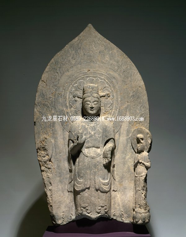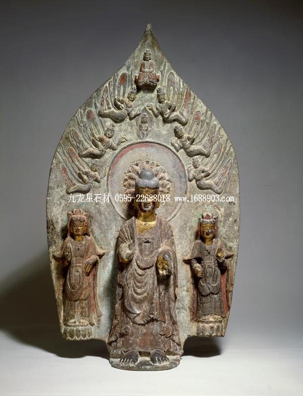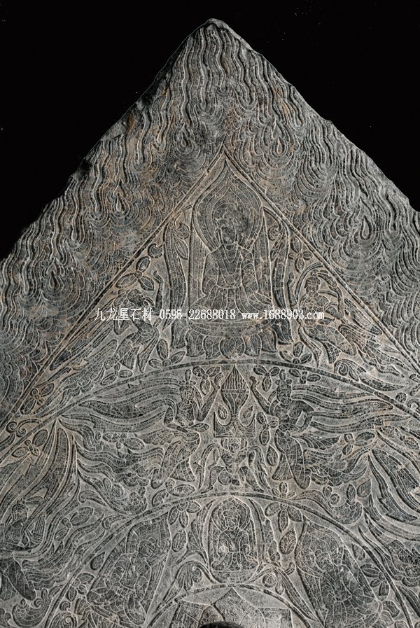石碑正面雕一佛二菩薩,菩薩腳邊有護(hù)法獅子,現(xiàn)只剩殘?bào)w。佛和菩薩面相清瘦,身軀修長(zhǎng),頭部和手腳近似圓雕,佛裝則以高淺浮雕展示不同層次。如佛身上的漢化褒衣博帶式袈裟和衣裙腳部重疊衣褶的造型。他們身后是火焰形大背光,上面用減地陽(yáng)刻和陰刻手法由中心向外畫出五個(gè)裝飾圈。中心圈是佛的頭光,內(nèi)有蓮花瓣;旁圈里是過去七佛;再外圈有六身飛天環(huán)繞,上部有一人形神獸頂一香爐,飛天或持蓮苞、香熏和樂器,姿態(tài)飄逸清揚(yáng);在此圈的尖頭部分又畫出第四圈,內(nèi)含一佛像,禪定趺坐于蓮花寶座上,側(cè)脅兩個(gè)飛天;最外圈是飛動(dòng)的火焰圖案。