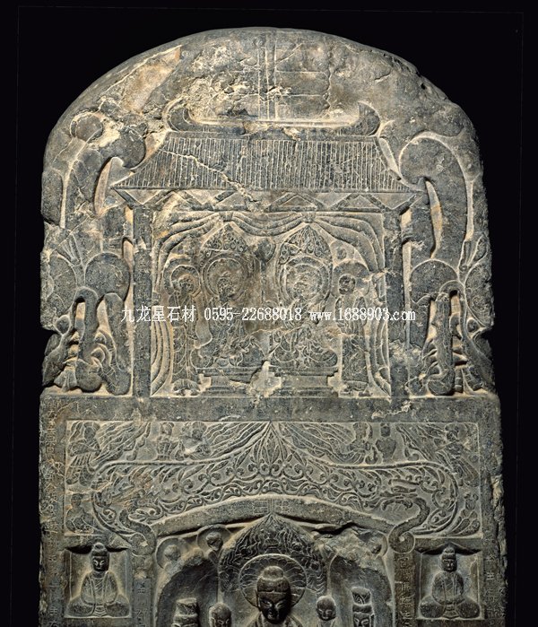 佛造像碑,西魏,公元549年,石灰?guī)r館藏的西魏石碑集兩種造像碑式樣于一體,即雙面數(shù)層佛龕式和千佛碑式。石碑正面是三段式構(gòu)圖。上段用減地陽(yáng)刻加陰刻的技法刻畫出維摩詰居士和文殊菩薩論法圖。人物刻畫秀骨清風(fēng),頗有魏晉名士風(fēng)流之韻。