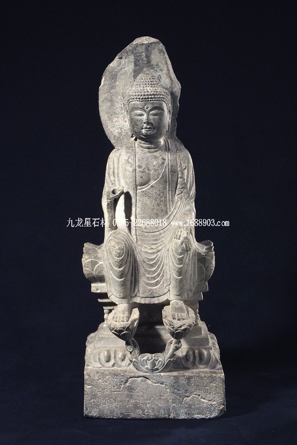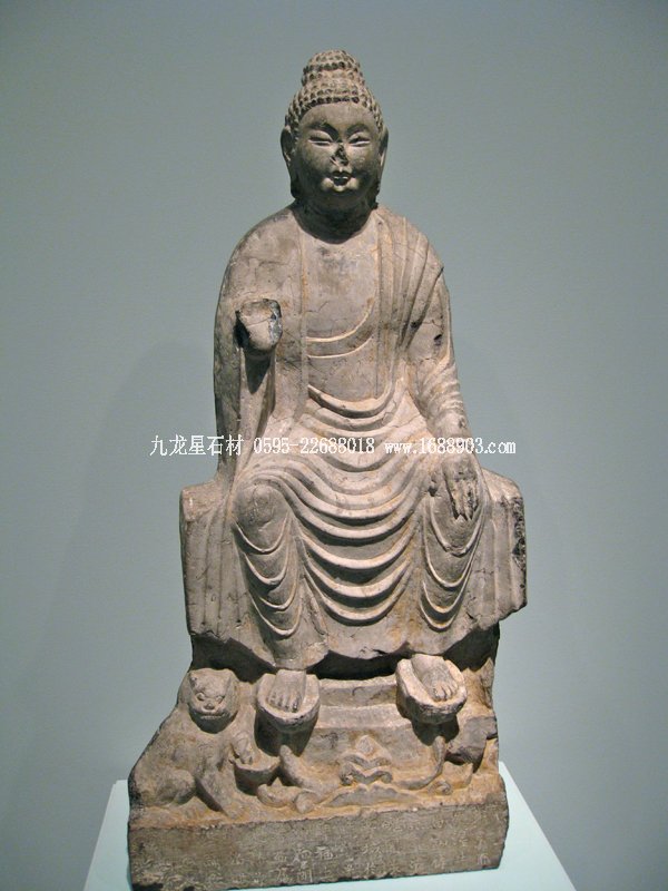 從北齊開始,中國(guó)石雕佛像趨向肢體、衣飾質(zhì)感的細(xì)節(jié)刻畫。至8世紀(jì)的唐代,佛像造型越顯自然寫實(shí),雕刻技法精湛,從而形成中國(guó)式佛像的模式。館藏的兩尊彌勒佛堪稱初唐時(shí)期的佳作。未來(lái)佛彌勒在形態(tài)塑造上與釋迦佛幾乎無(wú)異,不同之處在于彌勒佛的坐姿和手勢(shì)。彌勒佛不是盤腿結(jié)跏趺坐而是倚坐,即雙腳下垂踩蓮花。其手勢(shì)基本上有兩種:一種同交腳彌勒菩薩的手勢(shì),左手握衣角,按左膝,右手作無(wú)畏或說法印;另一種是一手心向下按膝,一手作無(wú)畏或說法印。這兩尊彌勒佛方額廣頤,臉頰豐滿,衣裟透體,衣紋刻畫生動(dòng)流暢。整體造型嚴(yán)整自然,神態(tài)顯得平易安詳。