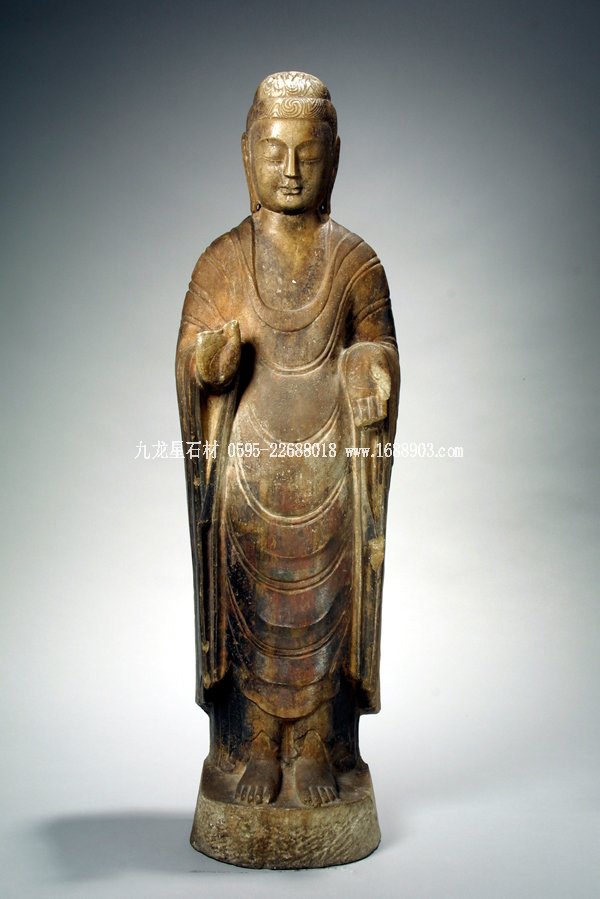 20世紀(jì)50年代在河北省曲陽(yáng)縣修德寺發(fā)掘出兩千余尊石造像,其中多有北齊和隋朝的紀(jì)年造像。曲陽(yáng)(古屬定州)一帶盛產(chǎn)大理石,在6世紀(jì)時(shí)已是佛像制作中心之一,至今仍有“雕刻之鄉(xiāng)”的稱謂。館藏思維彌勒像和立佛像,從材質(zhì)和風(fēng)格來(lái)看,應(yīng)歸屬于同時(shí)代的當(dāng)?shù)刈髌?。立佛像身軀雖然仍較扁平,但總體輪廓線圓潤(rùn),腹部微向前凸起,增添了視覺上的體積感。佛著通肩袈裟,衣薄貼體,U形衣紋用雙鉤陰線,平行下垂的間距遞減,富有節(jié)奏感,為同類作品所罕見。佛左手施與愿印,右手施無(wú)畏印,有漩渦發(fā)型,高肉髻,臉形方圓,面容親切,是北齊佛像的精品。