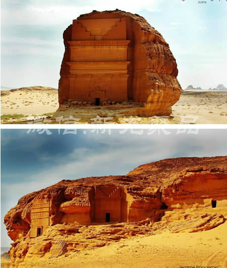 Mada’in Saleh 也被稱為Al-Hijr(巖石場),位于北漢志(今沙特阿拉伯),是猶太人和納巴泰人所居住的一座古老的城市,也被成為海格拉(詛咒之地)。這里被發(fā)現(xiàn)的一些銘文可追溯到公元前兩千年。然而,所有保留下來的建筑元素可以追溯至公元前1世紀(jì)和公元后第二個世紀(jì)的Thamudi,Lihyan和納巴泰文明時期。Mada’inSaleh不僅是沙特最壯觀的旅游景點,它也是世界最偉大的歷史遺跡之一。在清晨的日光中,石墓呈現(xiàn)給人的是一種非凡的美麗,陽光中投射下的影子和石墓形態(tài)各異,更給Mada’in Saleh真正增添了幾分魅力。其姊妹城市---佩特拉,納巴泰王國前首都,位于約旦邊境北部150公里。