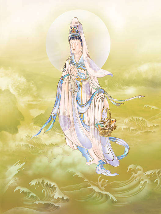 九、施藥觀音 寂靜施藥觀世音 尋聲救苦難思議 諦觀圓照三千界 楊枝凈水洗凡塵