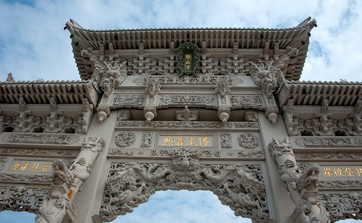 百余名惠安石雕師傅歷時兩年雕刻完工。梅山寺石質山門總高度23米,寬23.6米,全部由花崗巖石雕刻而成,四柱三門結構,大型山門總石方用量達680多立方米,居我國現有石質山門中石方用量之首。山門雕刻工藝高超,其復雜程度和難度全國罕見。斗拱采用的是整塊石材,