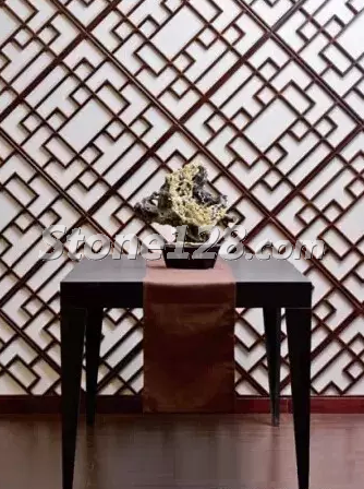 在新中式風(fēng)格的大廳中,石雕作品的外形與背景窗花的菱形相互協(xié)調(diào),取得了很好的諧調(diào)效果。石雕的色彩與整體環(huán)境的深色調(diào)相互統(tǒng)一,臘梅花典雅的黃色又活躍了色彩的意境氛圍。整體空間的直線風(fēng)格與石雕作品的曲線造型相對(duì)比,剛?cè)嵯酀?jì),收放有度,取得了很好的視覺效果。