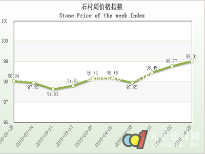 從4月石材周價格指數(shù)走勢圖看,本月石材周價格指數(shù)除2015-04-08期略下調(diào)外,總體基本呈現(xiàn)一路平緩推升的走勢,價格循序漸進調(diào)整。