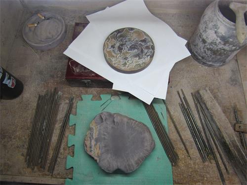 圖為胡楊老師正在創(chuàng)作蘑菇硯臺