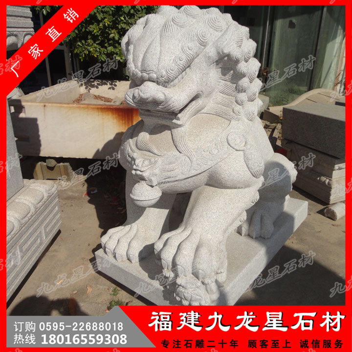石雕動物獅子的腦門寬闊隆起,天庭飽滿,下頜裂開,地閣方圓.眼窩深,眼球鼓,鼻根深陷,張嘴似欲吞欲笑,多呈憨態(tài).毛發(fā)呈卷曲紐狀,自然地附著頸項(xiàng)部,更顯得威而不怒,猛而不殘.石獅有雌雄兩種:雄獅口含圓珠,耳呈葉狀,兩邊超過卷毛高度,毛發(fā)卷曲很有規(guī)律,布滿了耳、頸部。有時腳蹬繡球,表示其性貪玩耍.而雌獅身上多背小石獅子,或足下踩小石獅,表示一種"母愛",很有情趣,一般情況下,門左置雄獅,門右置雌獅。
